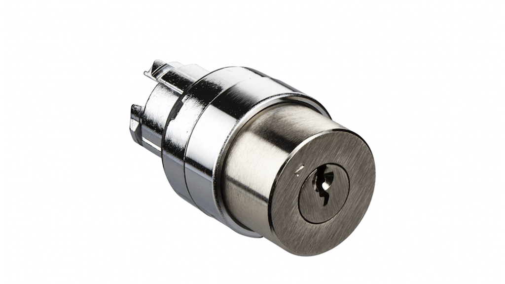 Selettore a chiave con testa Schneider Electric, lunetta in metallo cromato, diametro di montaggio 22 mm, due posizioni a 90 gradi, durata meccanica 1000000 cicli, grado di protezione IP66 e IP67, colore nero, tipo rotondo. Prodotto della serie Harmony XB4, progettato per applicazioni industriali.