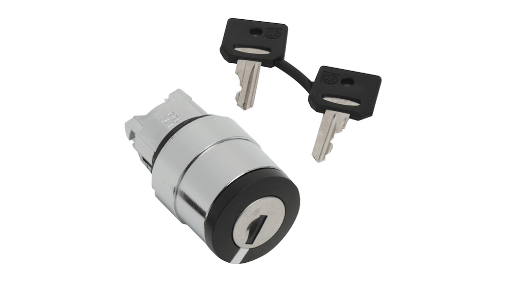 Testa selettore per interruttore a chiave, serie Harmony XB4, 2 posizioni, diametro foro 22mm, tipo chiave 458A, attivazione con ritorno a molla, protezione IP66, IP67, IP69, temperatura operativa da -40 a +70 gradi Celsius, durata meccanica 1000000 cicli, sistema di bloccaggio a innesto, manici neri in metallo cromato, compatibile con corpi/collari di fissaggio e corpi di contatto disponibili.