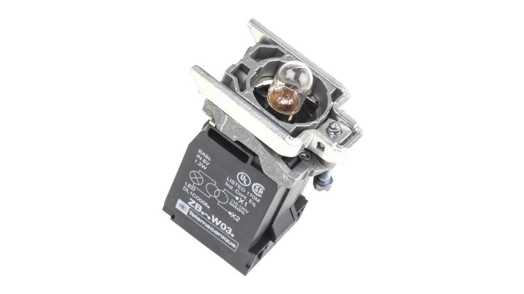 Blocco contatti e segnalazione per pulsanti luminosi, 1NO 1NC, tensione nominale 110-120 V c.a., corrente nominale 10 A, tipo terminale a vite, illuminazione LED verde inclusa, serie Harmony XB4, corpo completo con collare di fissaggio, autorizzazioni UL, CSA, CE, NEMA, standard IEC e JIS. Codice costruttore ZB4BW035, marchio Schneider Electric.