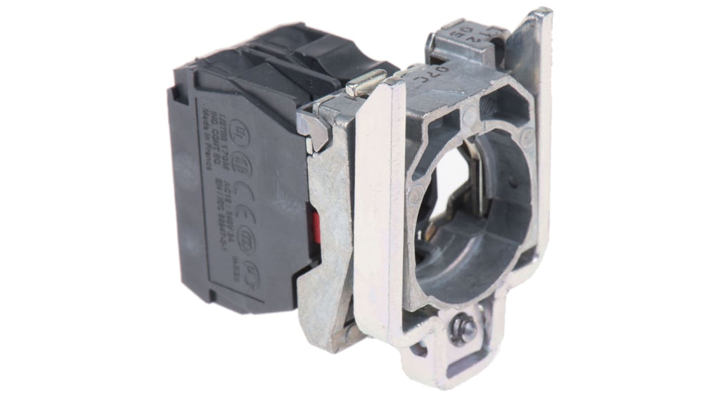 Blocco contatti luminoso con supporto, SPST, 250V, corrente nominale 10A, alimentazione diretta o a trasformatore 1,2VA, terminali a vite, corpi per pulsanti luminosi attacco BA9S, collare di fissaggio incluso, serie Harmony XB4, autorizzazioni UL, CSA, CE, NEMA, standard IEC, JIS.