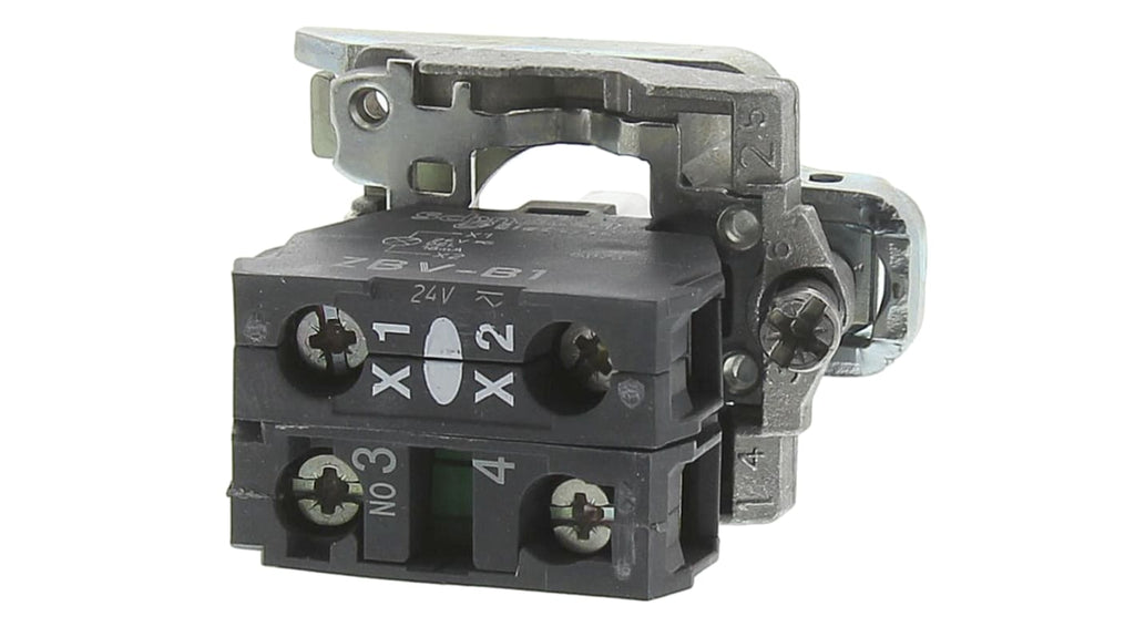 Blocco contatti con supporto, SPST, tensione nominale 24V ca/cc, corrente nominale 10A, LED integrato, terminali a vite, collare di fissaggio incluso, grado di protezione IP66, temperatura operativa da -40 a +70 gradi, conforme a EN/IEC 60947-1, 60947-5-1, 60947-5-4, UL 508, CSA C22.2 N. 14. Prodotto Schneider Green Premium, durata utile 100000 ore. Codice costruttore ZB4BW0B11.