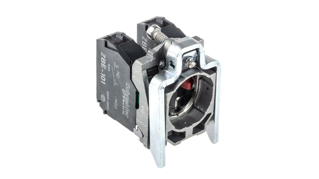 Blocco contatti con supporto, unità di contatto serie Harmony XB4, 1 contatto normalmente aperto e 1 normalmente chiuso, tensione nominale 600V, corrente nominale 10A, terminale a vite, corpo e collare di fissaggio inclusi, materiale Zamak, contatti in lega d'argento, grado di protezione IP20, coppia operativa 0,05Nm, conforme a UL e CSA. Adatto per installazioni elettriche e quadri di comando.