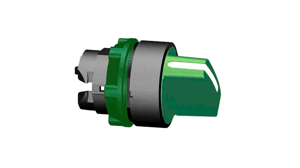 Testa selettore Schneider Electric ZB5, 2 posizioni, diametro foro 22mm, tipo attuatore selettore, protezione IP67 e IP69K, angolo di corsa 90 gradi, mercury free. Progettata per ambienti difficili, installazione su unità selettore compatibili. Colore verde, serie Harmony XB5.