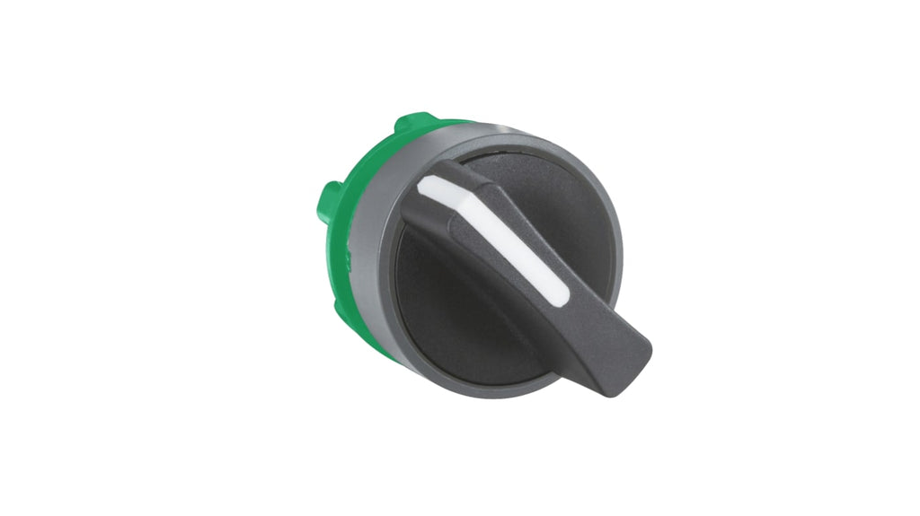 Testa dell'interruttore selettore Schneider Electric, 2 posizioni, diametro 22 mm, maniglia, colore nero, cornice grigia, meccanismo di ritorno a molla, durata meccanica 1.000.000 cicli, senza mercurio, conforme a RoHS, grado di protezione IP66, resistenza agli urti e alle vibrazioni, serie ZB5.