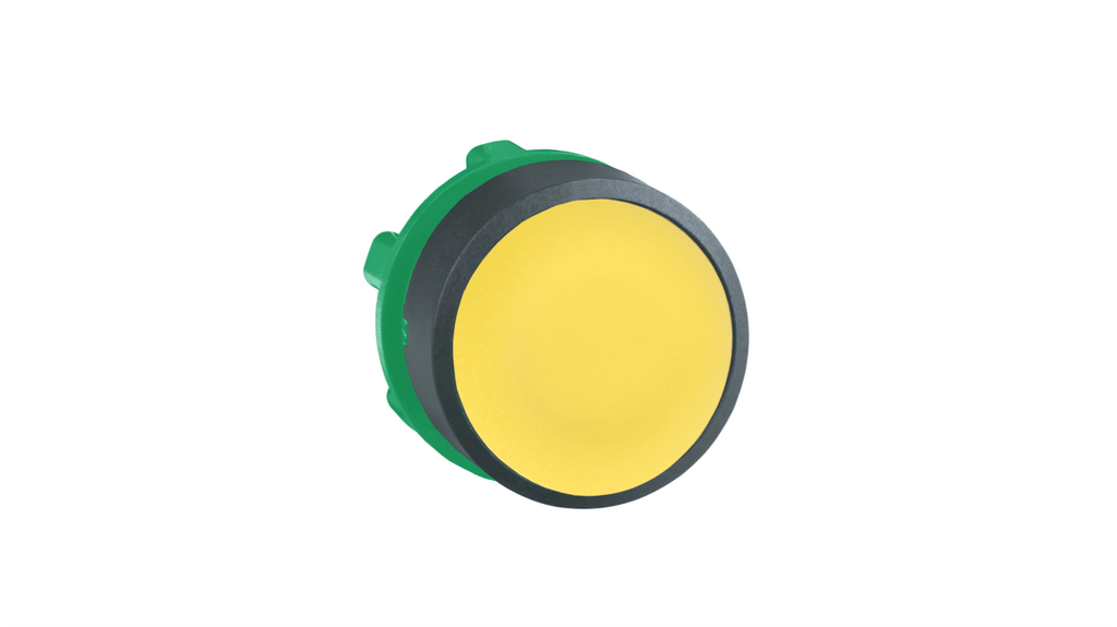 Attuatore pulsante tipo Mantenuto, rotondo, giallo, diametro foro 22 mm, diametro pulsante 28.5 mm, materiale plastica, protezione IP66, IP67, IP69K, temperatura operativa da -40 a +70 gradi Celsius, morsetto a vite, compatibile con corpi in plastica Harmony XB5, conforme a standard IEC, JIS, autorizzatori UL, CSA.