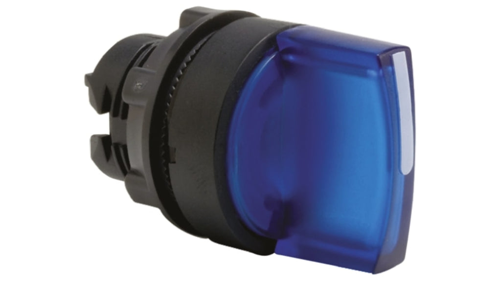 Teste illuminate per selettori, 2 posizioni, diametro 22 mm, impugnatura standard, colore blu, ritenuta, attivazione stabile, grado di protezione IP65, angolo di corsa 90 gradi, serie Harmony XB5, conformità a standard IEC, JIS, autorizzazioni UL e CSA.