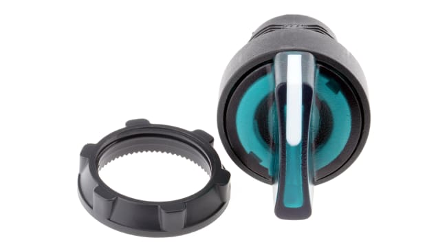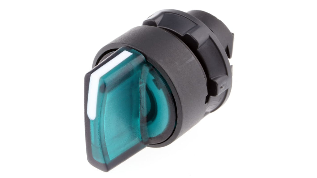 Teste illuminate per selettori, 3 posizioni, diametro 22 mm, impugnatura standard, colore verde, illuminato, attivazione stabile, serie Harmony XB5, protezione IP66, IP67, IP69, angolo di corsa 45 gradi, conformità a standard IEC, JIS, autorizzatori UL, CSA. Disponibili in rosso, blu, arancione e bianco. Codice costruttore ZB5AK1333.