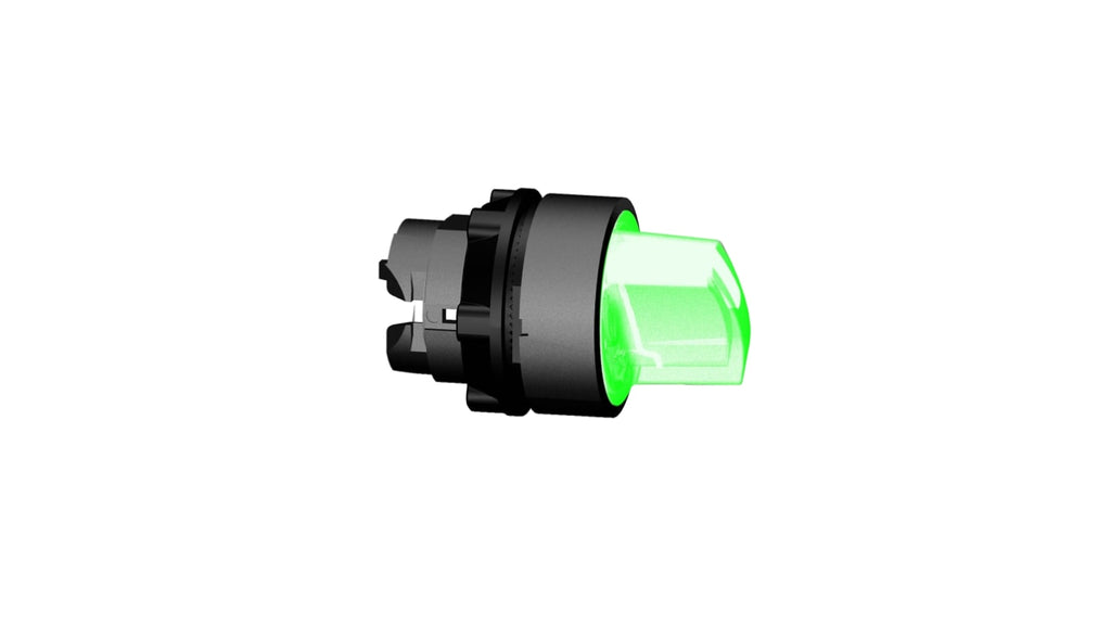 Testa di interruttore illuminata per selettore, Schneider Electric, 2 posizioni, diametro foro 22mm, tipo attuatore maniglia, colore attuatore verde, resistente agli urti, alla polvere, all'acqua e alle vibrazioni, temperatura d'esercizio da -40 a 70 gradi Celsius, serie ZB5, installazione su unità compatibili.