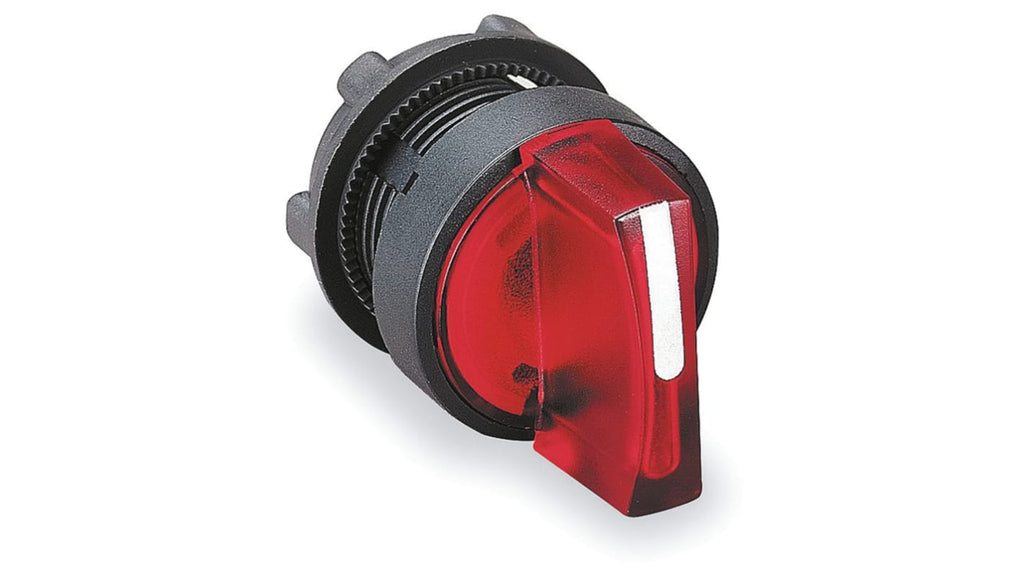 Teste illuminate per selettori, 3 posizioni, diametro 22 mm, impugnatura standard, colore rosso, illuminato, attivazione con ritorno a molla al centro, serie Harmony XB5, protezione IP65, angolo di corsa 45 gradi, conformità a standard IEC, JIS, autorizzazioni UL e CSA. Codice costruttore ZB5AK1543, marchio Schneider Electric.