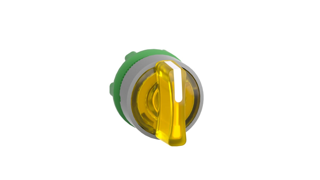 Testa di interruttore illuminata per selettore, 3 posizioni, diametro foro 22mm, manico ergonomico, colore attuatore giallo, resistente a urti, polvere, acqua e vibrazioni, temperatura d'esercizio da -40 a 70 gradi Celsius, compatibile con serie Harmony XB5, facile installazione su unità di interruttore selettore.