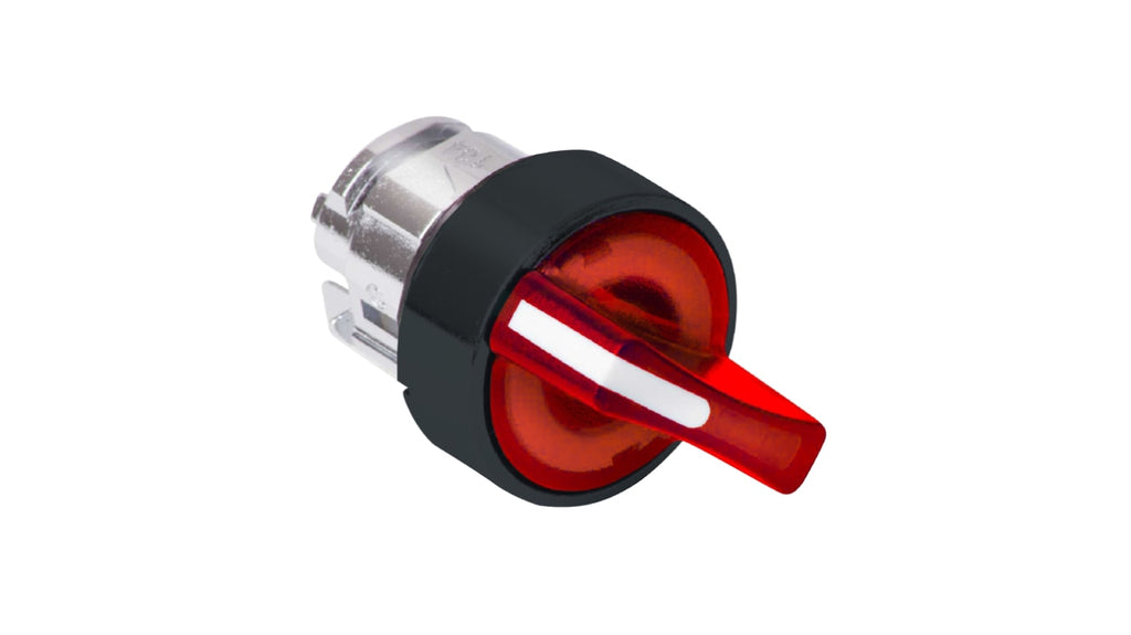 Testa di interruttore illuminata rossa per interruttore selettore, 3 posizioni, diametro foro 22mm, tipo attuatore manico, serie Harmony XB5. Temperatura d'esercizio da -40 a 70 gradi Celsius, resistente agli urti, alla polvere, all'acqua e alle vibrazioni. Fornisce feedback visivo chiaro, installazione semplice su unità compatibili.