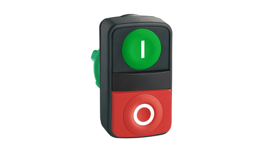 Pulsante a doppia testa con ritorno a molla, serie Harmony XB5, diametro foro 22mm, colori verde e rosso, attuazione rettangolare, materiale plastica, protezione IP67 e IP69K, temperatura operativa da -40 a +70 gradi Celsius, tipo terminale morsetto a vite, conforme agli standard IEC e JIS, autorizzato UL e CSA. Codice costruttore ZB5AL7340, marchio Schneider Electric.