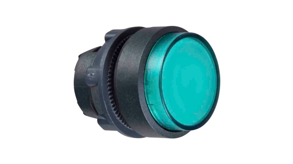 Attuatore pulsante tipo Instabile, testa illuminata sporgente verde, serie Harmony XB5, diametro foro 22mm, forma rotonda, attuazione a pulsante instabile, facile installazione e sostituzione su unità a pulsante complete compatibili e blocchi di contatti tramite assemblaggio a innesto, privo di mercurio. Marchio Schneider Electric, codice costruttore ZB5AW133.