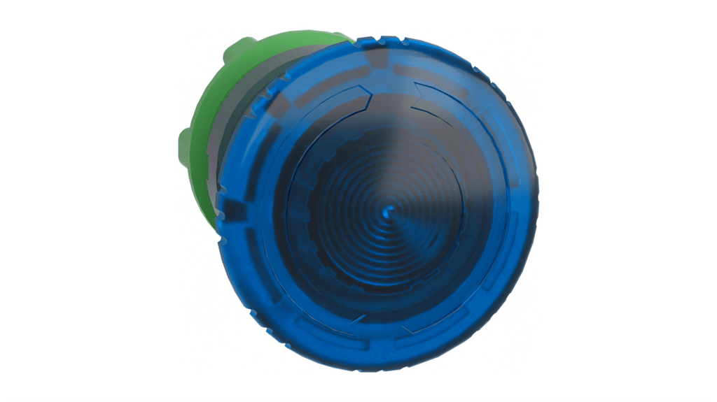 Pulsante a fungo luminoso, attuatore ad aggancio, serie Harmony XB5, diametro foro 22 mm, colore blu, testa rotonda, materiale plastica, illuminato, protezione IP66 e IP69K, operazione reset con rilascio a rotazione o push-pull, operatore di blocco, temperatura operativa da -40 a +70 gradi Celsius, terminale a morsetto a vite, conforme a standard CSA C22-2 No 14, EN/IEC 60947-1, EN/IEC 60947-5-1, EN/IEC 60947-5-4, EN/IEC 60947-5-5, JIS C 4520, UL 508, GB 14048.5.