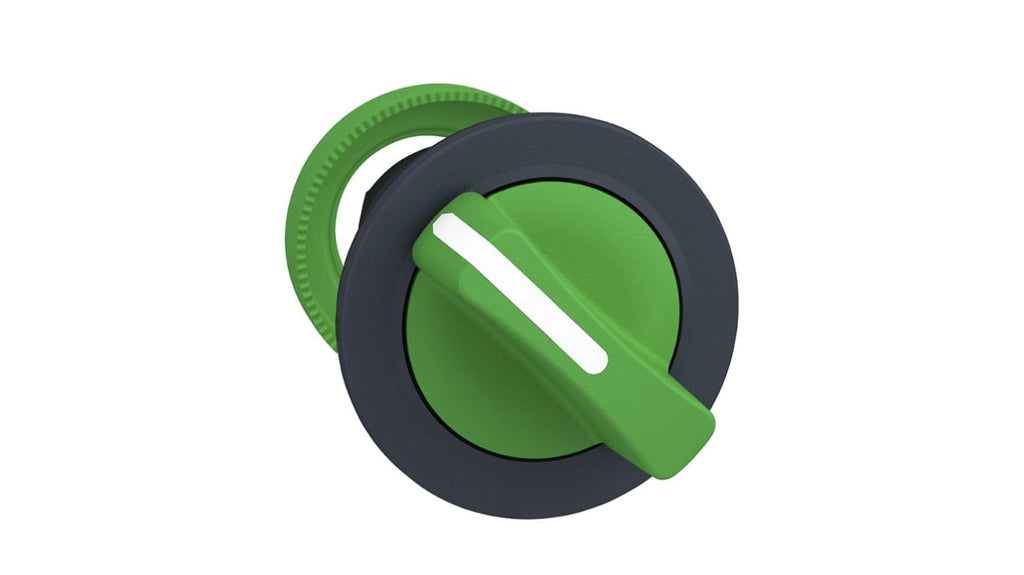 Testa selettore per applicazioni industriali, 2 posizioni, diametro di montaggio 30 mm, impugnatura standard verde, montaggio a filo, attivazione stabile, serie Harmony XB5, protezione IP66, IP67, IP69, angolo di corsa 90 gradi. Materiale della cornice in plastica. Settori di applicazione: produttori macchinari, industria chimica, cartiere, ambiente marino. Codice costruttore ZB5FD203.