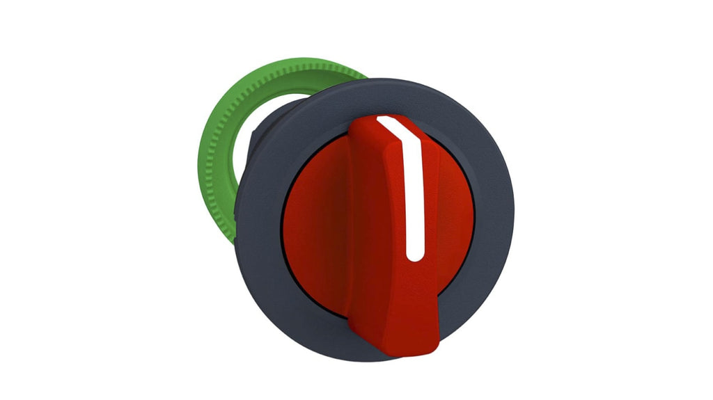 Testa selettore rossa a 3 posizioni, montaggio a filo, diametro 30 mm, impugnatura standard, stabile, angolo di corsa 45 gradi, materiale cornice in plastica, protezione IP66, IP67, IP69. Applicabile in settori come produttori macchinari, industria chimica, cartiere, ambiente marino, costruttori di pannelli per distribuzione energia, alimenti e bevande, autolavaggi. Codice costruttore ZB5FD304, serie Harmony XB5.