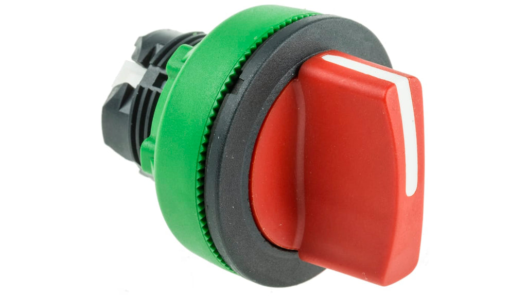 Testa selettore rossa a 2 posizioni con ritorno a molla da destra a sinistra, montaggio a filo, diametro di 30 mm, impugnatura standard. Materiale della cornice in plastica, grado di protezione IP66, IP67, IP69. Settori di applicazione: produttori macchinari, industria chimica, cartiere, applicazioni in ambiente marino. Codice costruttore ZB5FD404, serie Harmony XB5.