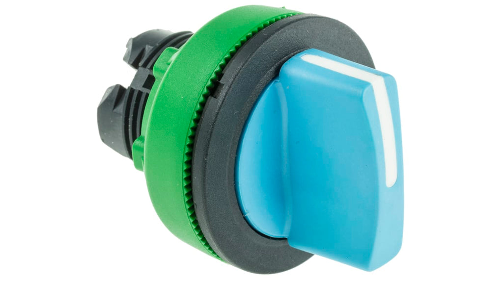 Testa selettore a 3 posizioni con ritorno al centro, diametro di montaggio 30 mm, impugnatura standard blu, montaggio a filo. Materiale della cornice in plastica, angolo di corsa 45 gradi, protezione IP66, IP67, IP69. Applicabile in settori come produttori macchinari, industria chimica, cartiere e applicazioni in ambiente marino. Codice costruttore ZB5FD506, marchio Schneider Electric.