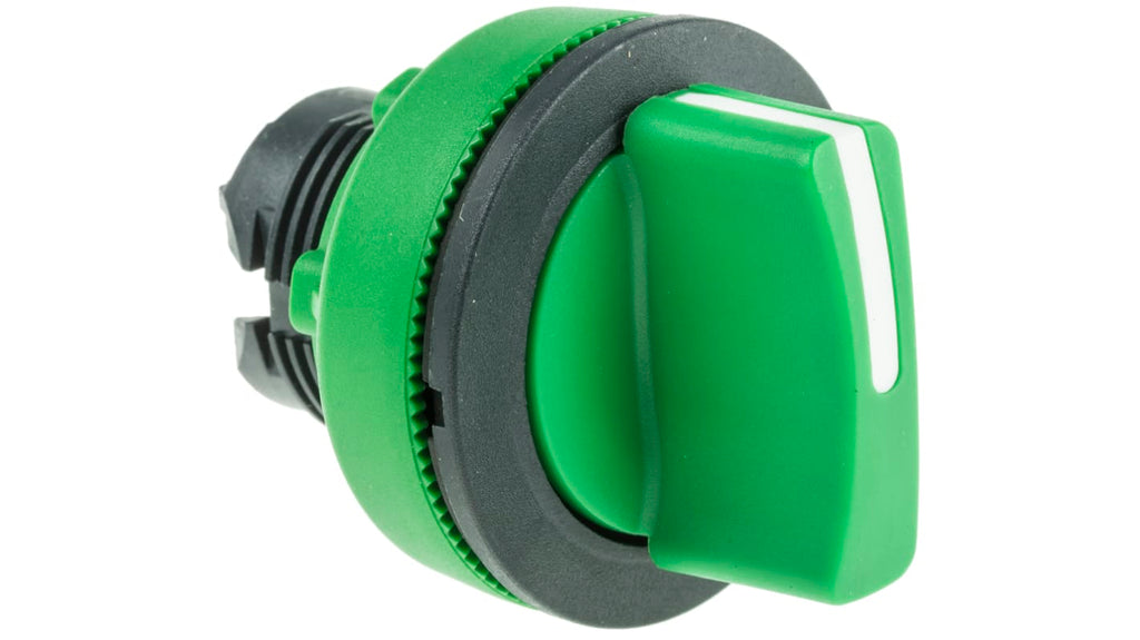 Testa selettore a 3 posizioni, diametro di montaggio 30 mm, impugnatura standard verde, montaggio a filo, ritorno a molla da sinistra al centro, angolo di corsa 45 gradi, protezione IP66, IP67, IP69K. Materiale della cornice in plastica. Applicabile in settori come produttori di macchinari, industria chimica, cartiere, alimenti e bevande. Codice costruttore ZB5FD703, marchio Schneider Electric.