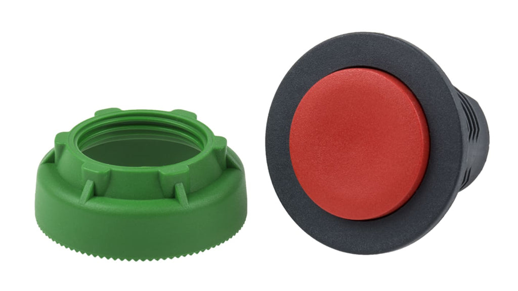 Attuatore pulsante tipo Instabile, testa rossa sporgente, montaggio a filo, serie Harmony ZB5, diametro foro 30mm, diametro pulsante 37mm, materiale plastica, protezione IP66, IP67, IP69K, senza marcatura, unità di segnalazione e controllo, applicabile in settori come produttori macchinari, industria chimica, cartiere, ambiente marino, costruttori di pannelli per distribuzione energia, alimenti e bevande, autolavaggi.