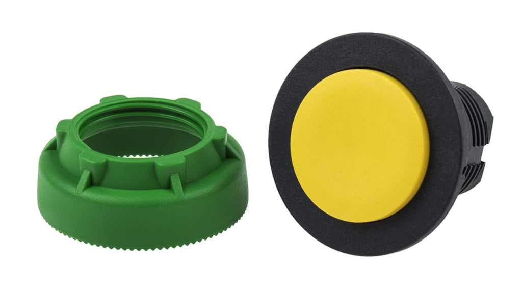 Attuatore pulsante tipo Instabile, testa sporgente gialla, montaggio a filo, serie Harmony ZB5. Diametro foro 30mm, diametro pulsante 37mm, materiale plastica, protezione IP66, IP67, IP69K. Applicabile in settori come produttori macchinari, industria chimica, cartiere, ambiente marino. Pulsante non illuminato, ritorno a molla, senza marcatura.