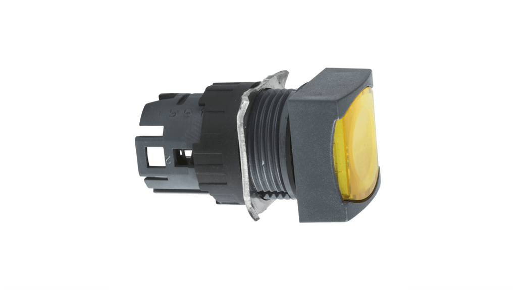 Attuatore pulsante tipo Instabile, giallo, serie Harmony XB6. Diametro foro 16 mm, protezione IP65. Testa del pulsante illuminata, cornice in plastica. Potenza Ue 250 V c.a., Ie 1,5 A; Ue 250 V c.c., Ie 0,1 A. Range di temperatura -25 °C a +70 °C. Componenti montabili facilmente su forature da 16 mm, disponibili blocchi di contatti con apertura positiva.