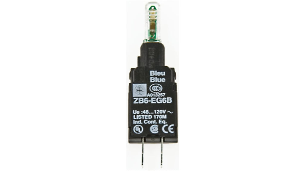 Blocco contatti luminoso, tensione nominale 48-120V ca, colore verde, illuminazione LED, tipo terminale Faston, collare di fissaggio incluso. Serie Harmony XB6, progettato per montaggio su forature da 16 mm, grado di protezione IP65, temperatura di esercizio da -25 a +70 gradi. Potenza Ue 250V ca, Ie 1,5A; Ue 250V cc, Ie 0,1A. Codice costruttore ZB6EG3B, marchio Schneider Electric.