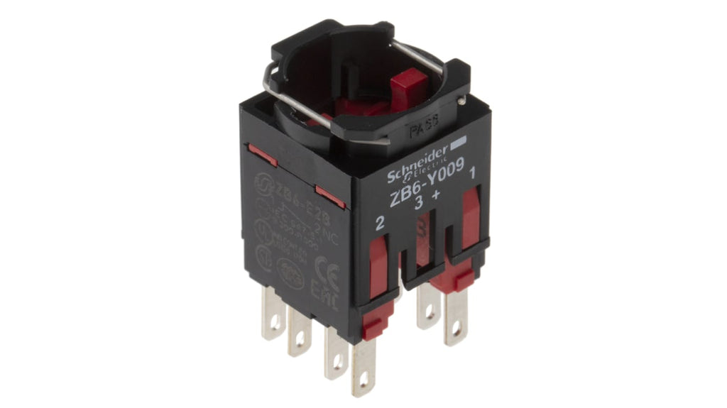 Blocco contatti Schneider Electric, 2NC, terminali a Faston, serie Harmony XB6. Tensione nominale 250 V, corrente 1,5 A, fusibile a cartuccia 6 A, durata elettrica 1.000.000 cicli. Temperatura di esercizio da -25 a 70 gradi Celsius. Montaggio anteriore, collare di fissaggio in plastica resistente. Grado di protezione IP65, conforme a EN/IEC 60947-1, 60947-5-1, 60947-5-4. Prodotto Schneider Green Premium. 18 mesi di garanzia.