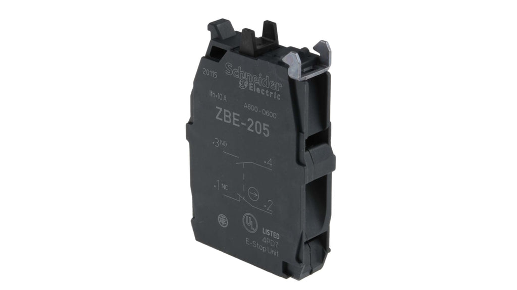 Blocco contatti per applicazioni industriali, configurazione 1 NA + 1 NC, terminali a vite. Serie Harmony XB4/5, durata meccanica 100.000.000 cicli, conforme a EN/IEC 60947-5-1 e 60204-32, UL 508 e CSA C22.2 N. 14. Resistenza alle vibrazioni 5 gn, urti fino a 30/50 gn. Prodotto Green Premium, 18 mesi di garanzia. Montaggio diretto su piastra di base.