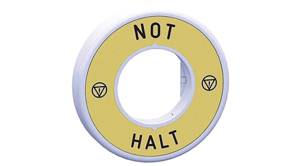 Anello legenda illuminato per pulsante di arresto di emergenza, compatibile con serie Harmony di Schneider Electric, codice ZBY9W2B230. Tensione nominale 24 V, assorbimento di corrente 18 mA, dimensioni 60 mm x 9,3 mm, materiale plastica. Illuminazione a LED rossa, testo in tedesco "NOT HALT" su sfondo giallo. Grado di protezione IP66, IP67, IP69, conforme a EN/IEC 60947-1 e direttive RoHS e REACH.