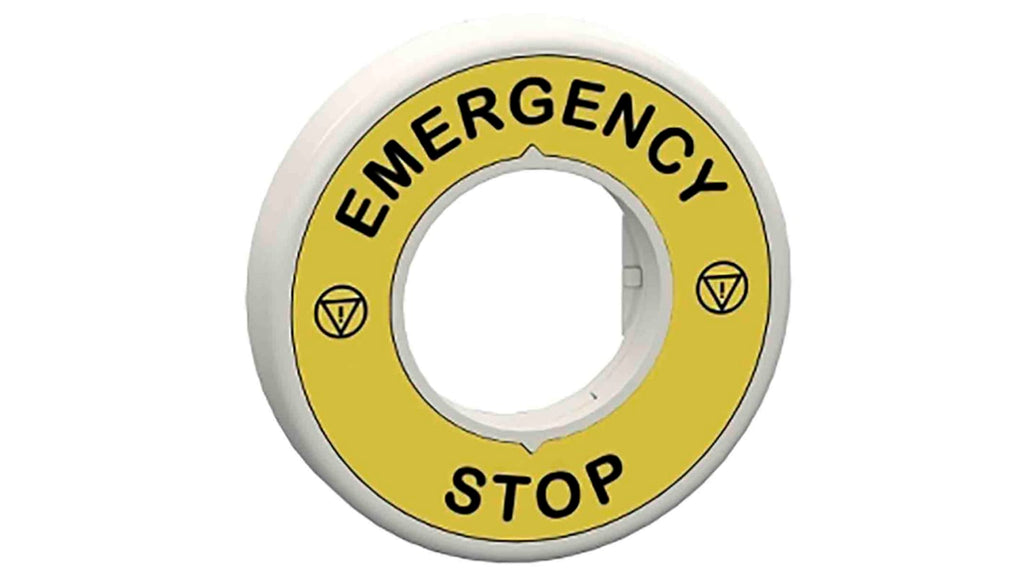 Anello legenda illuminato per pulsante con testa a fungo per arresto di emergenza, tensione 24V, dotato di 2 LED fissi bianco/rosso, etichetta gialla con logo. Prodotto della serie Harmony, progettato per garantire visibilità e identificazione chiara in situazioni di emergenza. Accessorio compatibile con dispositivi di sicurezza industriale. Codice costruttore ZBY9W3B330.