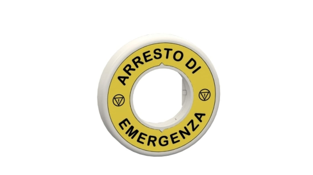 Anello legenda illuminato per pulsante con testa a fungo per arresto di emergenza, tensione 24V, potenza 2W, testo LED fisso, logo etichetta gialla, compatibile con serie Harmony, accessorio per segnalazione di emergenza.