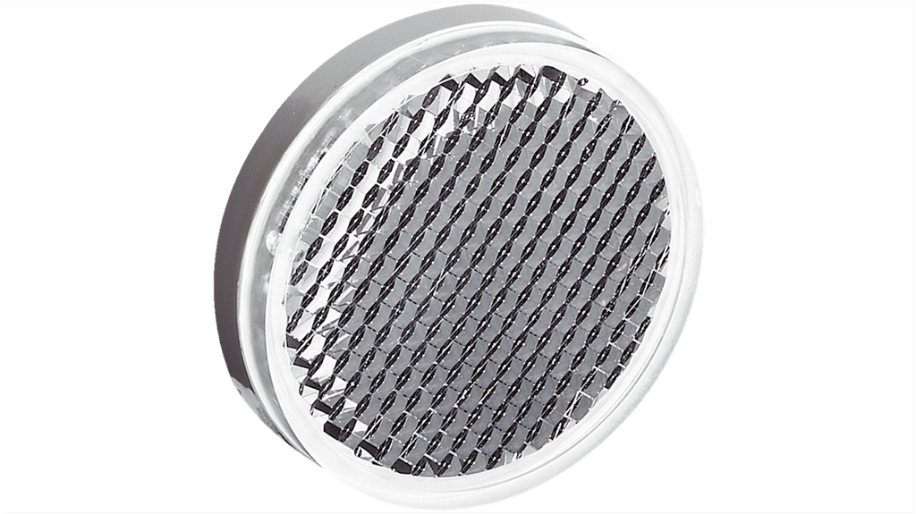 Riflettore rotondo per montaggio a vite, codice C42-2, marchio Sick. Realizzato in PMMA/ABS, include bullone filettato M5x9, dado esagonale e rondella. Tipo accessori: riflettore, serie C42.