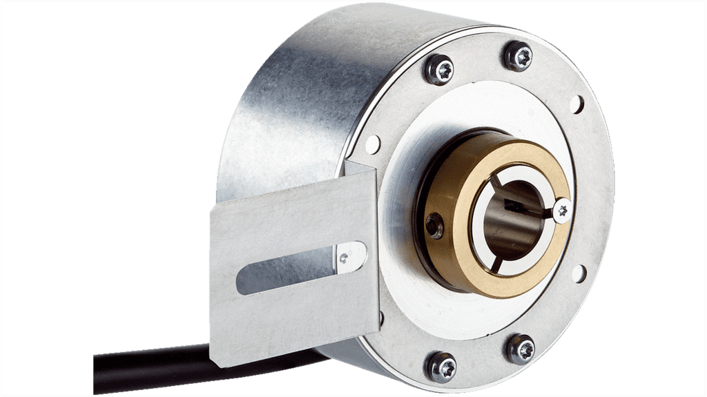 Encoder incrementale, 1024 impulsi per giro, diametro albero 12 mm, uscita TTL, tecnologia RS-422, montaggio a flangia, grado di protezione IP67, temperatura operativa da -20 a +85 gradi, corrente nominale 50 mA, alloggiamento in acciaio inox o alluminio, dimensioni 60 mm di diametro, 43.8 mm di altezza, 44.5 mm di larghezza, profondità 43.8 mm.