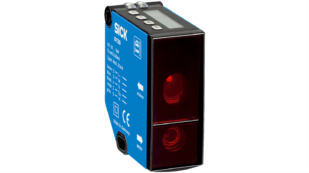 Sensore fotoelettrico rettangolare per rilevamento di distanza, gamma 100 a 600 mm, uscita NPN, con connettore maschio M12 a 5 pin. Tensione massima 30V, corrente massima 100 mA, tempo di risposta 2,5 ms. Grado di protezione IP65, temperatura operativa da 20 a 55 gradi Celsius. Custodia in metallo, sorgente di luce laser rossa. Modello DT20-N214B, marchio Sick.