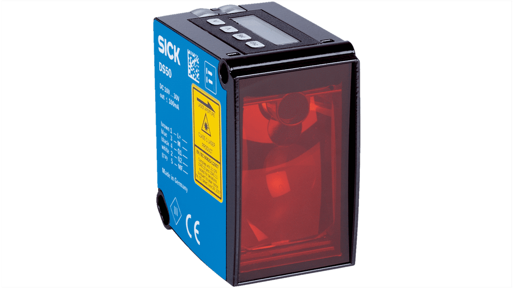 Sensore di distanza rettangolare, rilevamento da 200 a 10000 mm, uscita PNP, con connettore M12 a 5 pin. Tensione massima 30V, tempo di risposta 20 ms, temperatura operativa da -30 a +65 gradi Celsius, grado di protezione IP65. Custodia in metallo, luce laser rossa, conforme a CE, registrazione cULus, EAC. Modello DT50-P1114, marchio Sick.