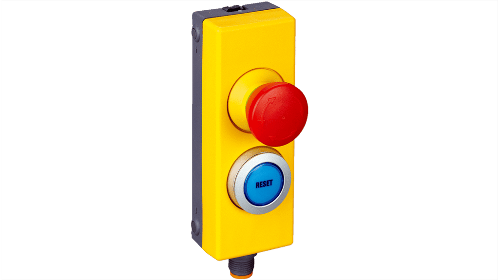 Pulsante di arresto di emergenza montaggio a pannello, diametro 22mm, configurazione contatto 2NC/1NO, attuazione a pulsante, rilascio a rotazione, protezione IP65, colore nero, rosso, giallo, materiale PBT, dimensioni 123mm x 40mm x 52mm, tensione nominale 30V ca/cc, serie ES11, compatibile con Flexi Loop M12.