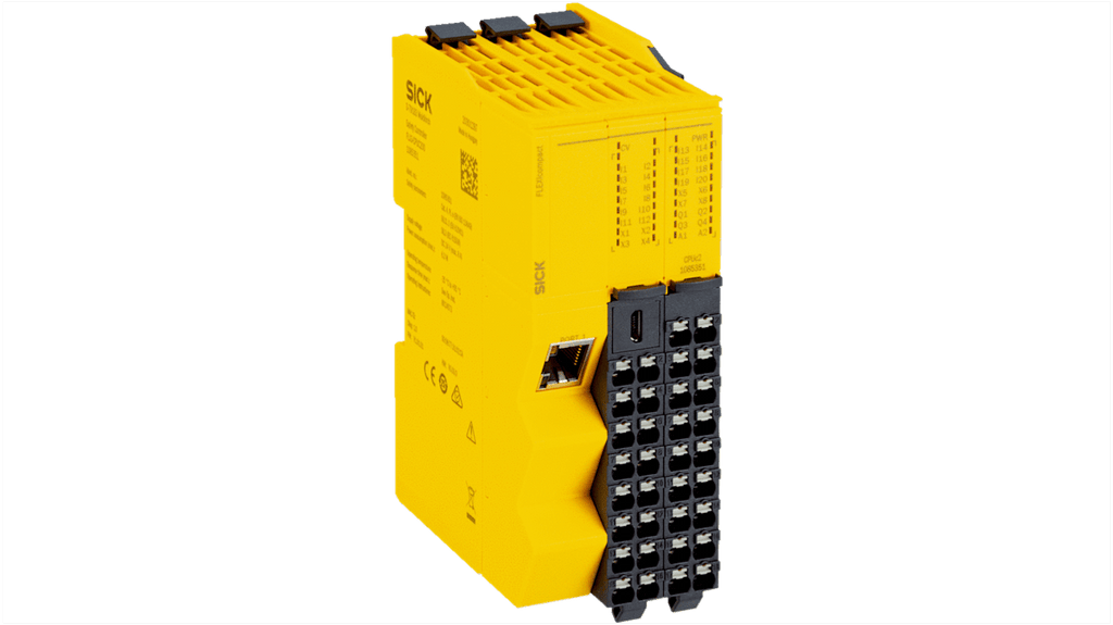 Controller di sicurezza modulare, unità di elaborazione centrale, 24 V, 20 ingressi, 4 uscite, potenza nominale 0,003 kW, montaggio su guida DIN, morsetto a molla, classe di protezione III, categoria di sovratensione II, grado di protezione IP20, dimensioni 46,2 x 85,5 x 124,7 mm. Codice costruttore FLX3-CPUC200, marchio Sick.