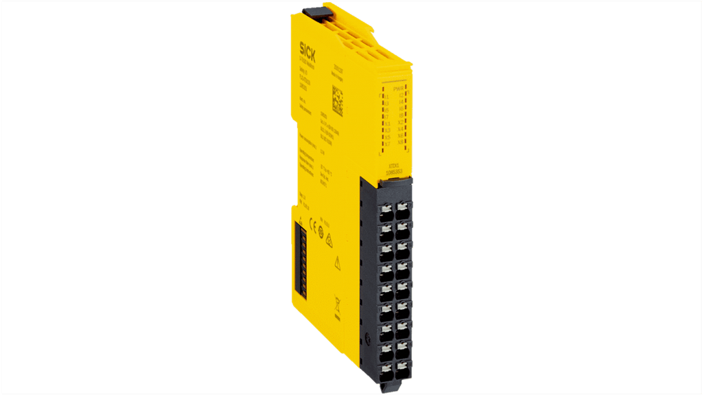 Modulo di ingresso/uscita Sick Flexi Compact, 24 V, 8 ingressi, 8 uscite, alimentazione tramite backplane bus, classe di protezione III, categoria di sovratensione II, grado di protezione IP20, montaggio su guida DIN, morsetto a molla, dimensioni 14 x 85,5 x 124,7 mm, potenza nominale 0,0024 kW, compatibile con FLX3-CPUC100 e FLX3-CPUC200.