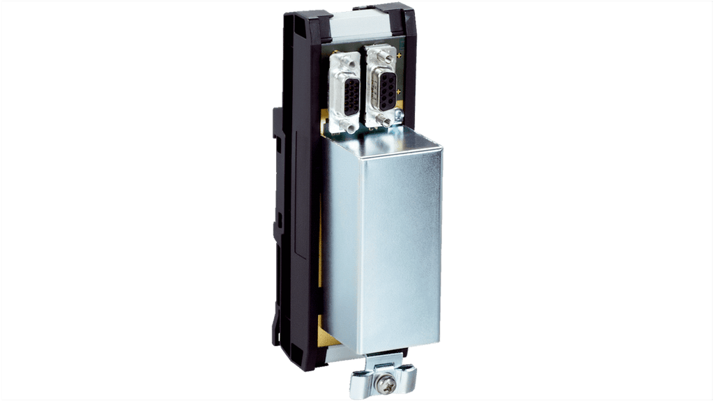 Modulo I/O per retroazione motore. Connettività per encoder e sistemi di feedback, progettato per integrazione con moduli di controllo FX3-MOC. Connettore femmina D-Sub HD, 15 pin, per collegamento diretto, e punto di estensione con connettore femmina D-Sub HD, 9 pin. Orientamento verticale, serie FX3.