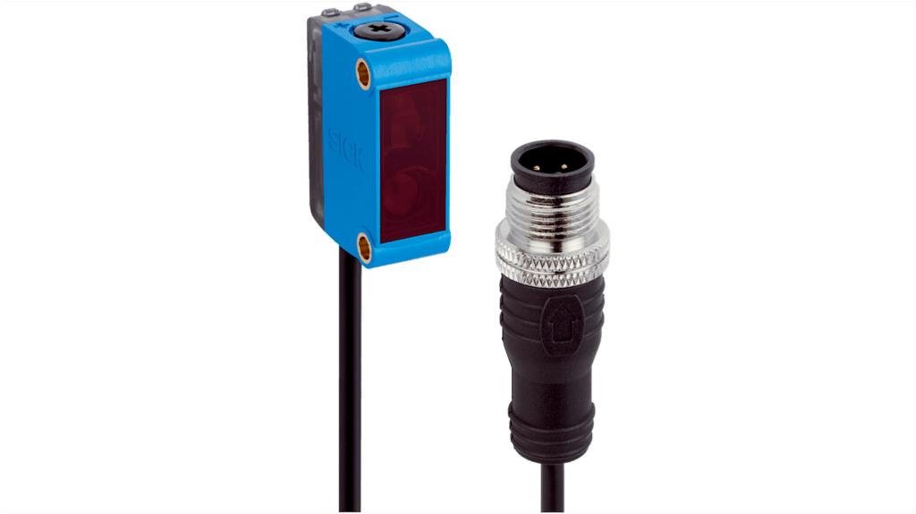 Sensore fotoelettrico rettangolare a retroriflessione, gamma di rilevamento 6 m, uscita PNP, con connettore M12 maschio a 4 pin. Custodia in plastica, grado di protezione IP67, temperatura operativa da -25 a +55 gradi Celsius, corrente massima 100 mA, tempo di risposta 0,625 ms. Standard CE e cULus. Montaggio a pannello. Modello GL6-P0212S48, marchio Sick.