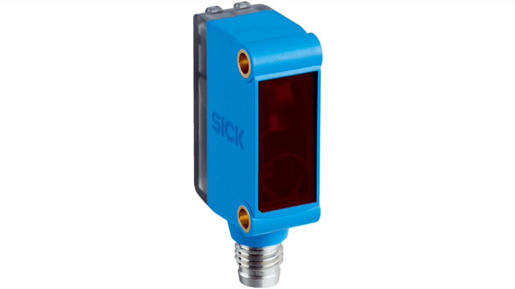 Sensore fotoelettrico miniaturizzato a retroriflessione, gamma di rilevamento 7,2 m, uscita PNP, montaggio a pannello, grado di protezione IP67, custodia in plastica, connettore maschio M8, tensione massima 30V, corrente massima 100 mA, tempo di risposta inferiore a 625 microsecondi, temperatura operativa da -25 a +55 gradi Celsius, conforme a CE e cULus.