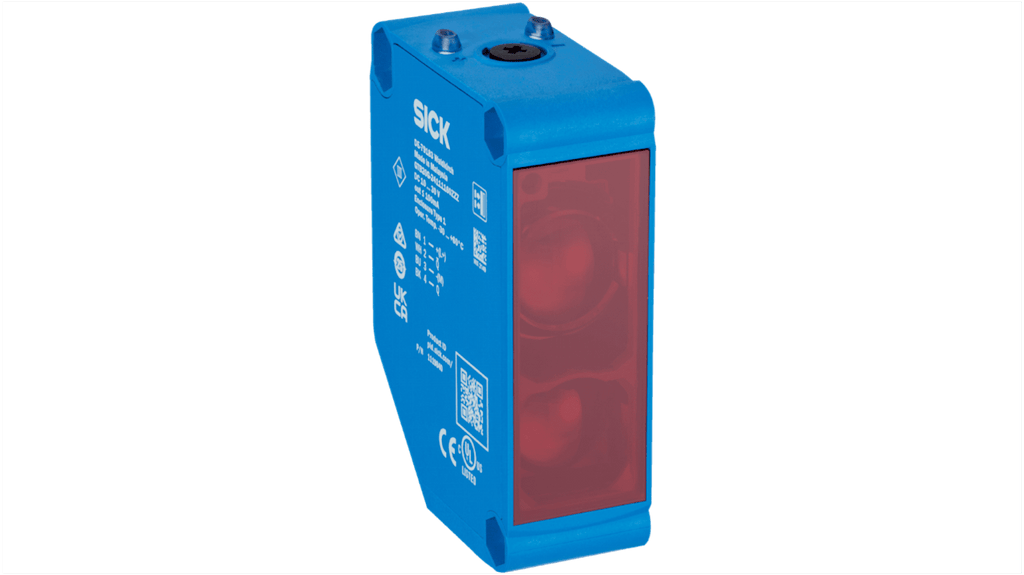 Sensore fotoelettrico rettangolare a retroriflessione, gamma di rilevamento 20 m, uscita PNP/NPN, grado di protezione IP67, alimentazione CC e CA/CC, corrente massima 100 mA, tempo di risposta 500 μs, temperatura operativa da -30 a +60 gradi Celsius, materiale custodia plastica, connettore maschio M12, LED di stato. Conforme agli standard CE. Codice costruttore GLD20G-24112170ZZZ, marchio Sick.