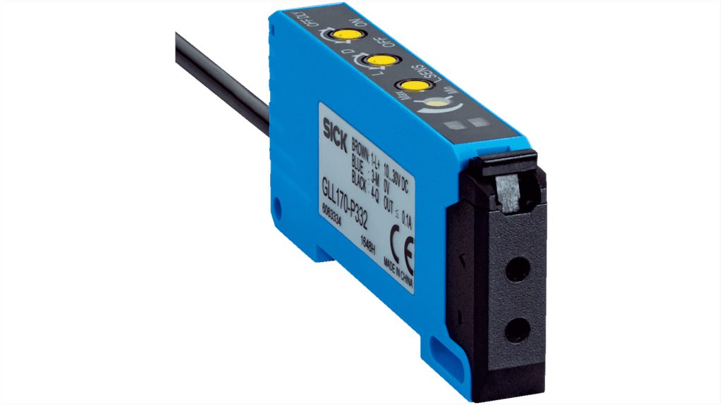 Sensore per fibre ottiche, PNP, tensione di alimentazione 10-30 V CC, grado di protezione IP66, tempo di risposta 50 microsecondi, frequenza di commutazione fino a 10 kHz, dimensioni 72,5 x 33,1 x 10 mm, materiale custodia plastica, temperatura operativa da -25 a +55 gradi Celsius, montaggio su circuito stampato, connessione tramite cavo. Compatibile con fibre della famiglia LL3.