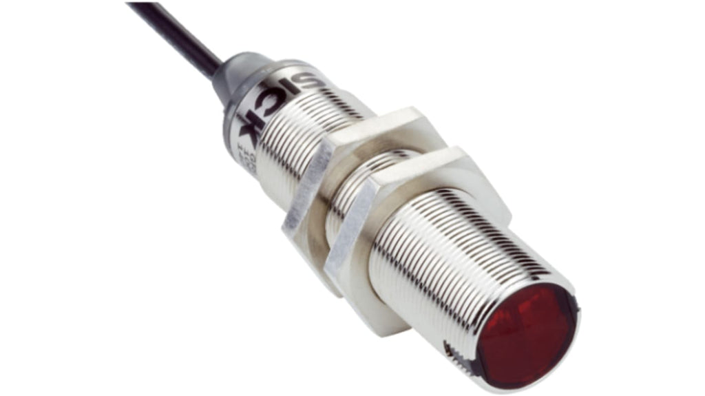 Sensore fotoelettrico cilindrico a retroriflessione, gamma di rilevamento 7,2 m, uscita PNP, grado di protezione IP67, custodia in metallo, temperatura operativa da -25 a +55 gradi, tempo di risposta 500 μs, connettore a 4 pin, LED di indicazione. Design compatto, versatile per applicazioni industriali. Codice costruttore GRL18-P1132, marchio Sick.