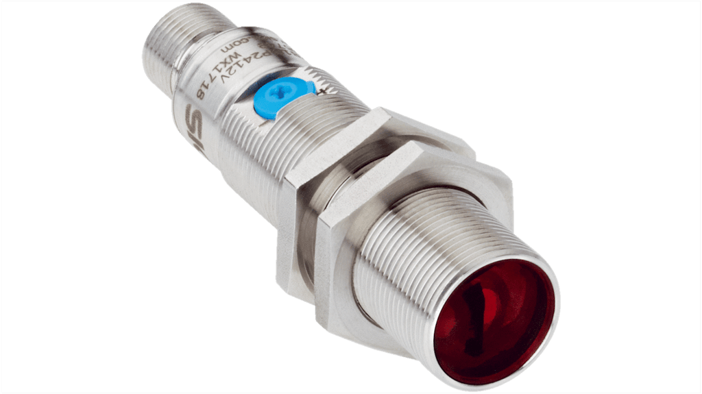 Sensore fotoelettrico cilindrico a soppressione di sfondo, gamma di rilevamento 3 mm a 300 mm, uscita PNP, connettore M12 a 4 pin. Grado di protezione IP67, IP68, IP69K, custodia in acciaio inox 1.4404/316L, certificazione Ecolab. Temperatura operativa da -25°C a +55°C, corrente massima 100 mA, tempo di risposta 0,0005 secondi. Standard CE e UL certificati.