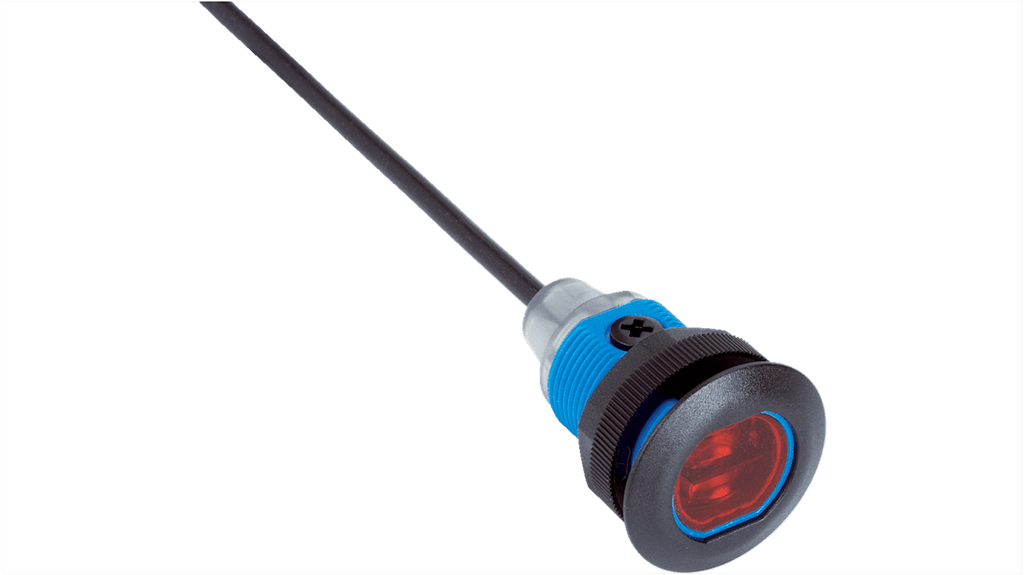 Sensore fotoelettrico cilindrico a soppressione di sfondo, gamma di rilevamento 3 mm a 300 mm, uscita NPN, grado di protezione IP67. Contenitore in plastica o metallo, LED PinPoint ad alta visibilità, potenziometro per regolazione soglia di commutazione. Corrente massima 100 mA, tensione massima 30V, tempo di risposta 0,0005 secondi, temperatura operativa da -25°C a +55°C. Certificazioni CE e UL.