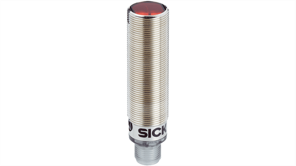 Sensore fotoelettrico cilindrico Sick, rilevamento da 3 mm a 115 mm, uscita commutazione luce/buio PNP, grado di protezione IP67, connettore M12 a 4 pin, tensione massima 30V, corrente massima 100 mA, tempo di risposta 0,001 secondi, temperatura operativa da -25°C a +55°C, custodia in materiale nichelato, design standard M18, montaggio semplice senza staffe speciali.