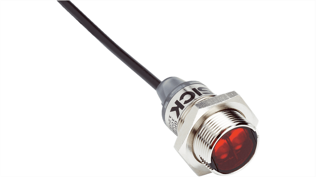 Sensore fotoelettrico cilindrico, rilevamento 550 mm, uscita NPN, alloggiamento in plastica, grado di protezione IP67, tensione massima 30V, corrente massima 30 mA, tempo di risposta 1 ms, temperatura operativa da -25°C a +55°C, filettatura M18 x 1, cavo a 3 fili di 5 m, sorgente di luce rossa visibile, conforme a CE e UL.