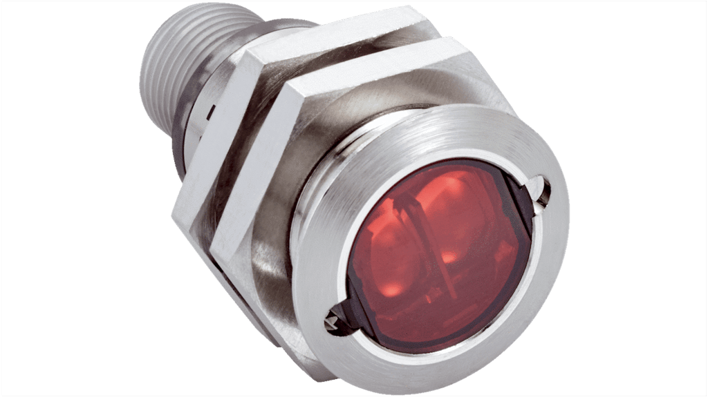 Sensore fotoelettrico cilindrico M18, rilevamento da 3 mm a 115 mm, uscita commutazione luminosa PNP, grado di protezione IP67, tensione massima 30V, corrente massima 100 mA, tempo di risposta 0,001 secondi, temperatura operativa da -25°C a +55°C, connettore M12 a 3 pin, custodia in metallo nichelato, design compatto per applicazioni industriali.